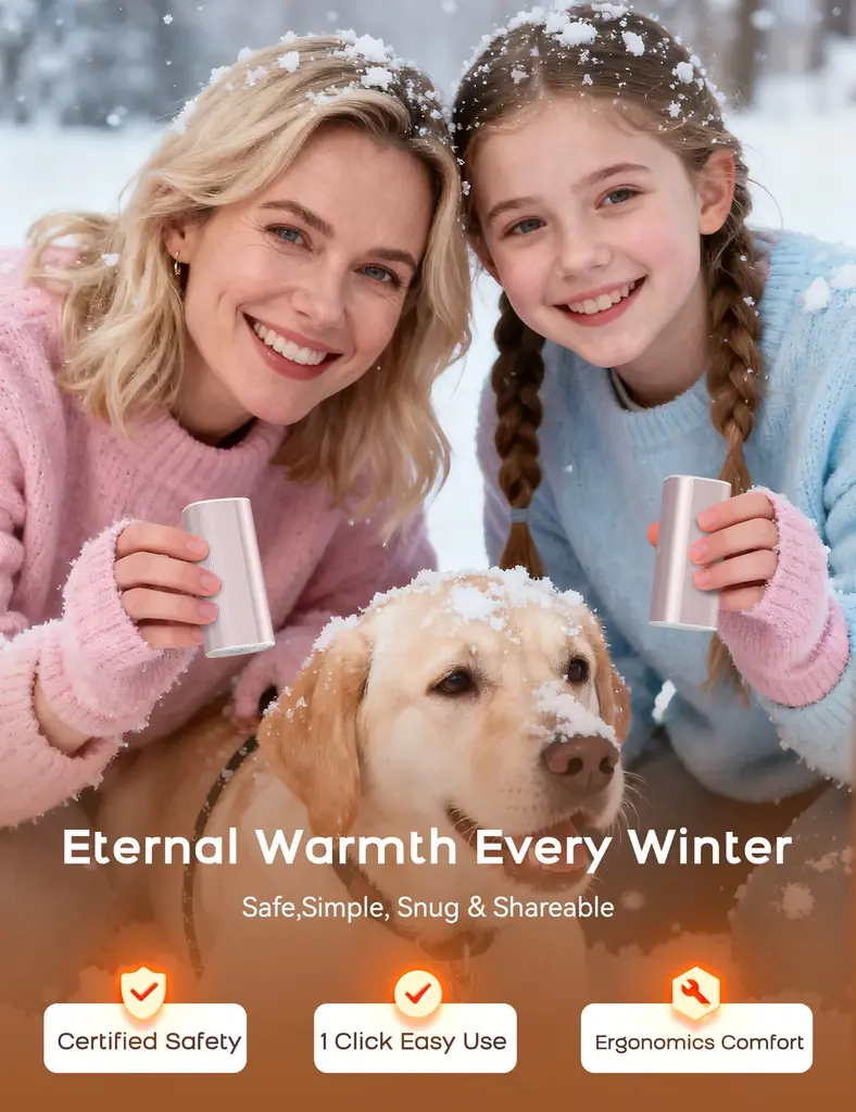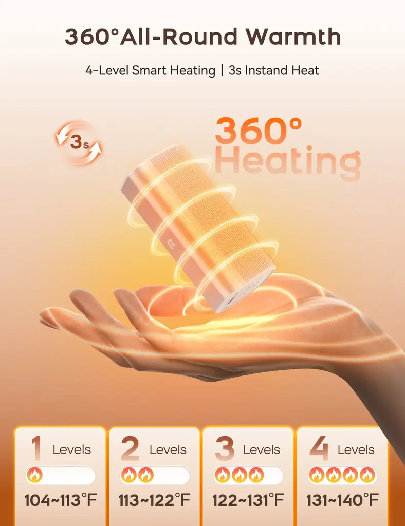 本製品の特徴は2個セットで合計10000mAhの大容量バッテリーと、3秒の急速加熱、および360°全面発熱設計にあります。これにより通勤・旅行・屋外作業など、長時間の利用環境でも安定した温かさが得られます。