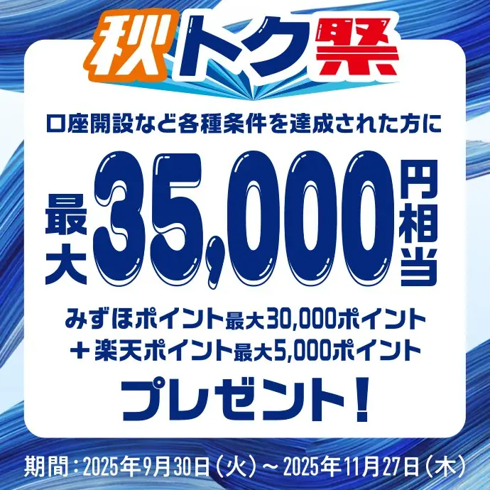 『秋トク祭』では複数の特典を組み合わせることで、総額最大35,000円相当(みずほポイント最大30,000ポイント+楽天ポイント最大5,000ポイント)を受け取ることができます。各特典は条件を満たすことが前提で、組合せにより合計が算出されます。