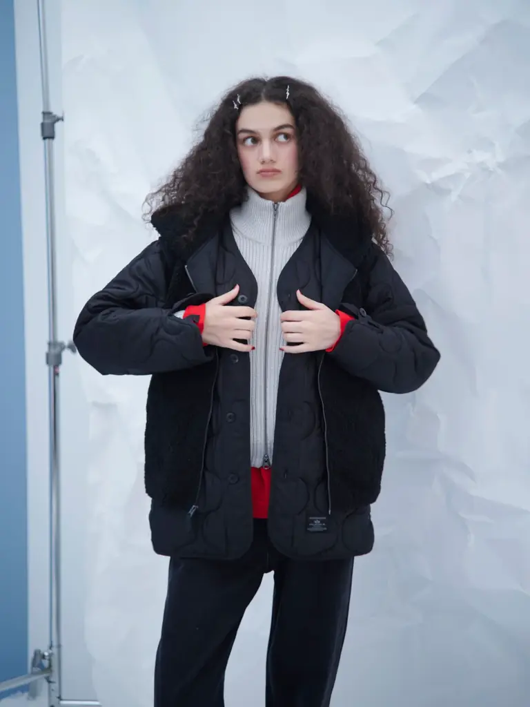ALPHA INDUSTRIESは米国のミリタリーウェアブランドで、MA-1フライトジャケットなどの代表作で知られ、米軍への供給実績もあるブランドです。今回のコラボでは、ALPHAが開発したALSライナー(ALPHA LINER SYSTEM)をアップデートしたキルティングジャケットと、ボアフーディベストを組み合わせたスペシャルなカスタマイズが行われています。