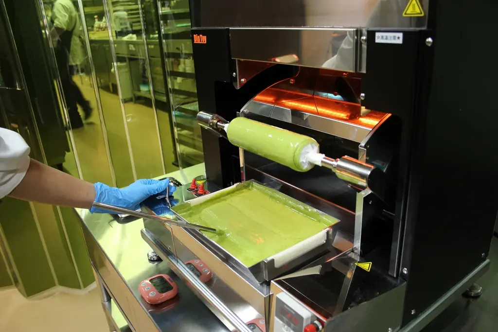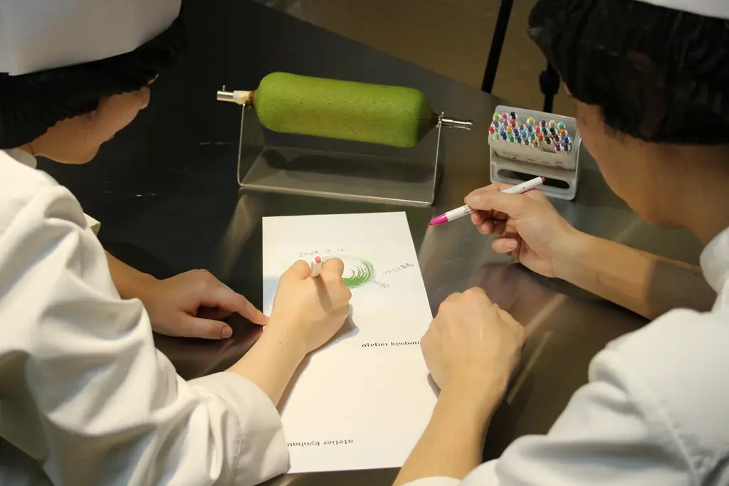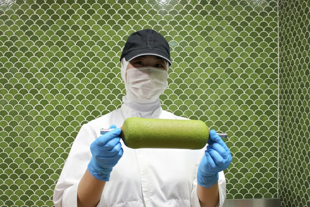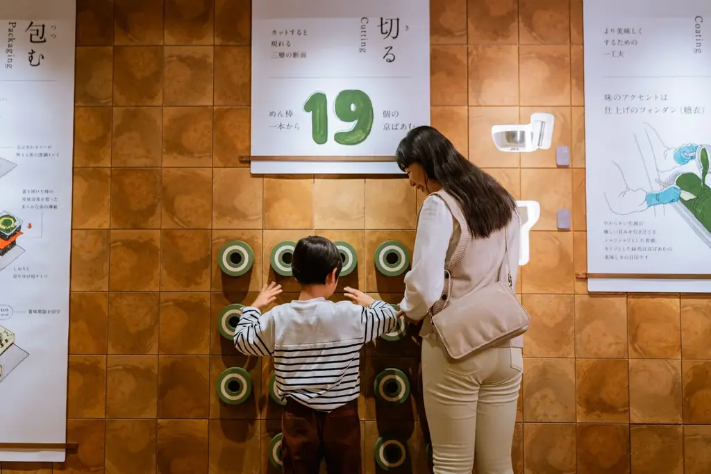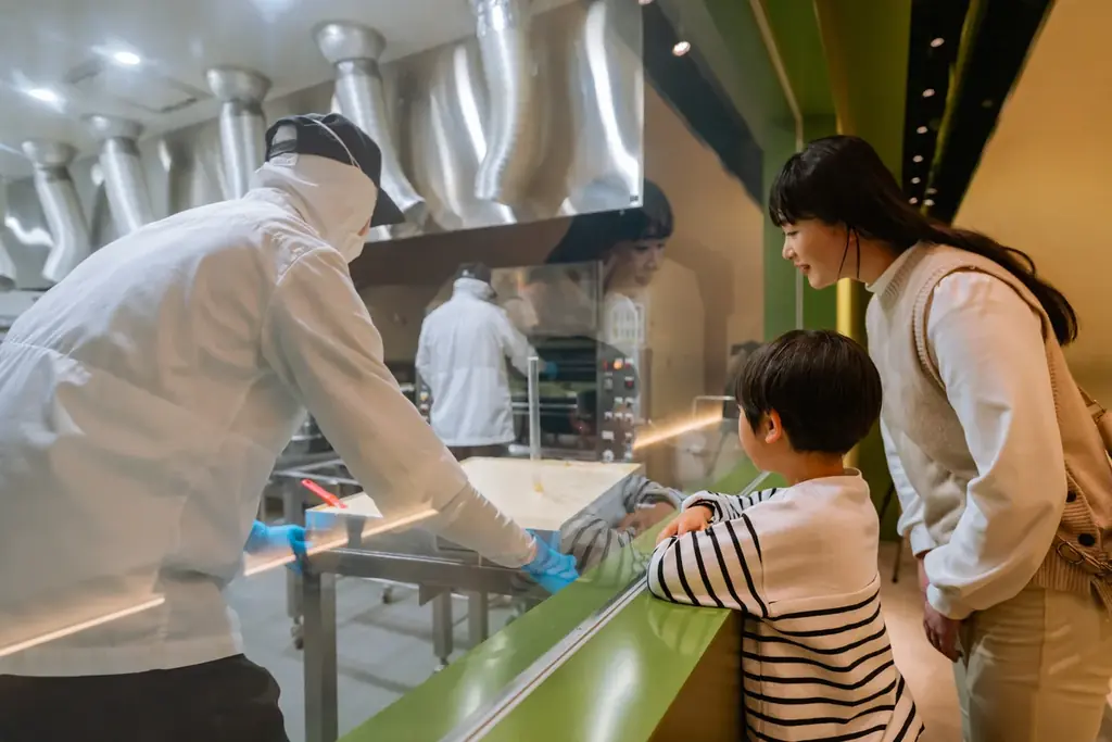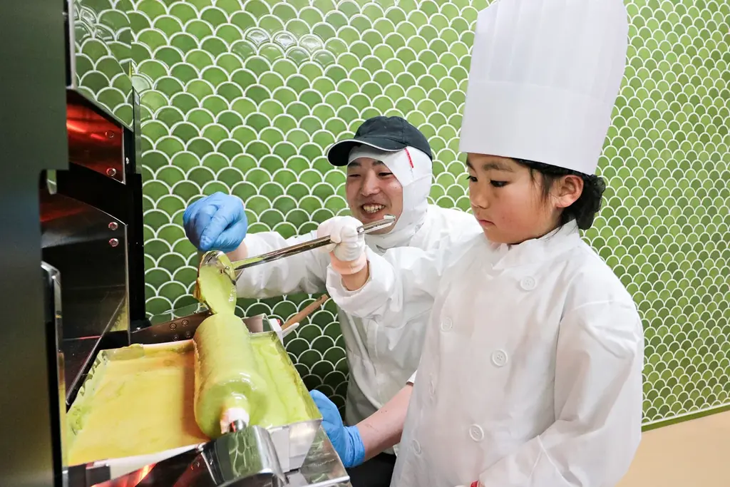 小学生以上のお子さまには、有料・要事前予約の「抹茶miniばあむ1本焼き体験」も用意されています。atelier京ばあむで日常的にバームクーヘンを焼いている職人が、きれいに焼き上げるコツを教えながら、ミニサイズの抹茶バームクーヘンを1本焼き上げる内容です。