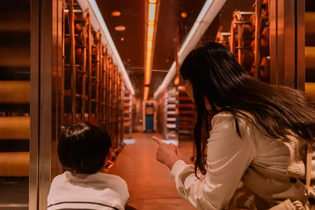 見学通路からは焼成の様子を間近に確認できるほか、バームクーヘンを保管する「エイジング室」や素材・製法について学べるライブラリを設置しています。1階のメインショップでは製品購入も可能です。