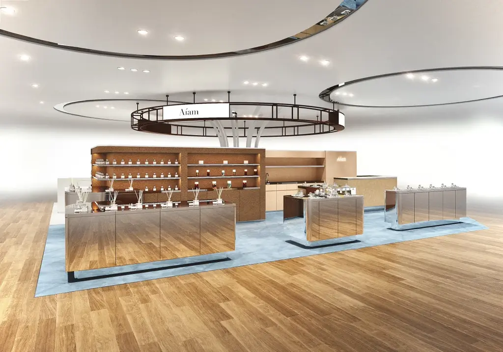 新内装は視覚的なカラーコントラストと触感の差異を活かす設計になっています。ライトグリーンやブルーなどの色合いが落ち着きを与え、ベージュやブラウンの素材が温かみを添えます。これにより、来店客が香りを試す際の心理的障壁を下げることを狙いとしています。