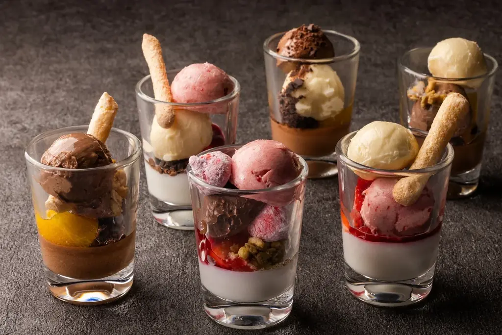 デザートは食べ放題の10種類に加え、スタッフがその場で仕上げる「マイ・チョイス・パフェ」などの体験型メニューが組み合わさっています。季節感や食感のコントラストに配慮したラインアップです。