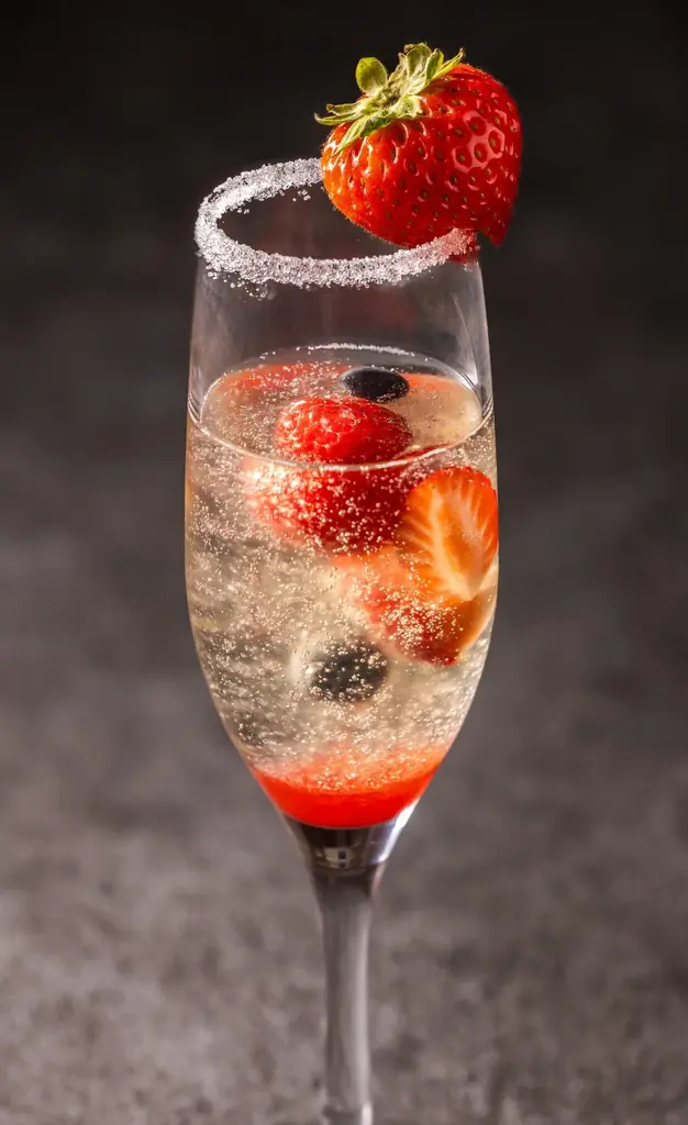 - ジュエル・スパークリング(平日限定・大人1名1杯):苺とブルーベリーを浮かべたノンアルコールの華やかなスパークリング。グラスの縁にグラニュー糖と苺シロップを組み合わせています。