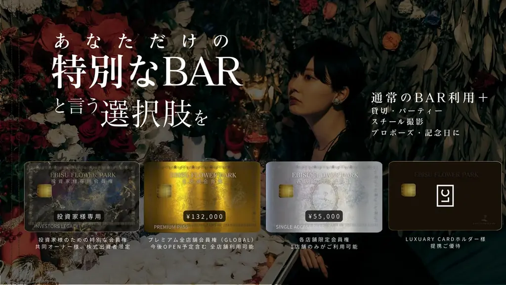 EBISU FLOWER PARKは完全会員制・住所非公開を維持する会員制フラワーバーです。会員権を購入した方が利用でき、その会員は同伴者として最大3名までを連れての入店が可能です。今回の新宿VIP店は「VIP」の冠を付けた特別仕様で、会員制の利便性と特別感を兼ね備えています。