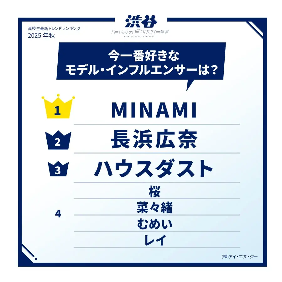 - モデル・インフルエンサー1位 MINAMI (6.0%)、長浜広奈 (5.5%) 等