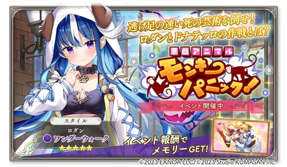 イベントストーリーや報酬は、特定のバトルステージをクリアして入手する「ストーリーキー【悪戯アニマル モンキーパニック!】」により段階的に解放されます。プレスリリースによれば、猿を模した木像の“死の芸術”が暴れており、ロダンとドナテッロが相手の身軽さに対抗する作戦を試みるというあらすじが用意されています。