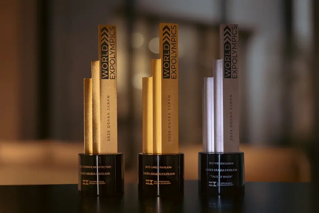 2025年大阪・関西万博に出展中のサウジアラビア王国館が、国際的な体験デザインの評価機関であるWorld Expolympics(ワールド・エキスポオリンピック)の表彰プログラムにおいて、「大規模館部門」と「外観建築部門」で金賞を受賞しました。併せて、夜のショー「水の物語」は「プレゼンテーション部門」で銀賞を受賞し、World Expolympicsでは合計3つのトロフィーを獲得しています。