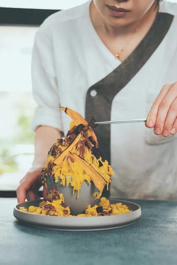 - 3ヶ月熟成 種子島産安納芋(蜜芋クリーム)、特製ソフトクリーム、ヘーゼルナッツメレンゲ、クランブル、カシスクリーム、クラッシュドチョコレート、チョコレートソース