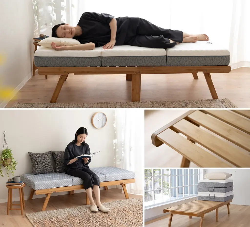 WABINEは「寝る、座る、たたむ」という使い方を想定して設計されており、折りたたみが容易で少ない力で操作できる構造です。折りたたんだ際は省スペースに保管でき、ゲスト用ベッドや海外転居時の家具としても利用可能です。