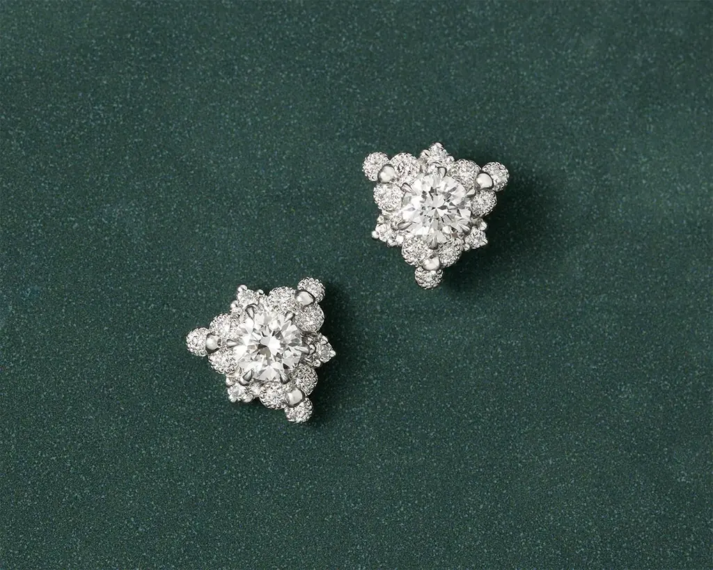 - Pt Diamond Pierced Earrings ¥374,000 — ダイヤモンドの小花がセンターストーンを可憐に引き立てるピアス