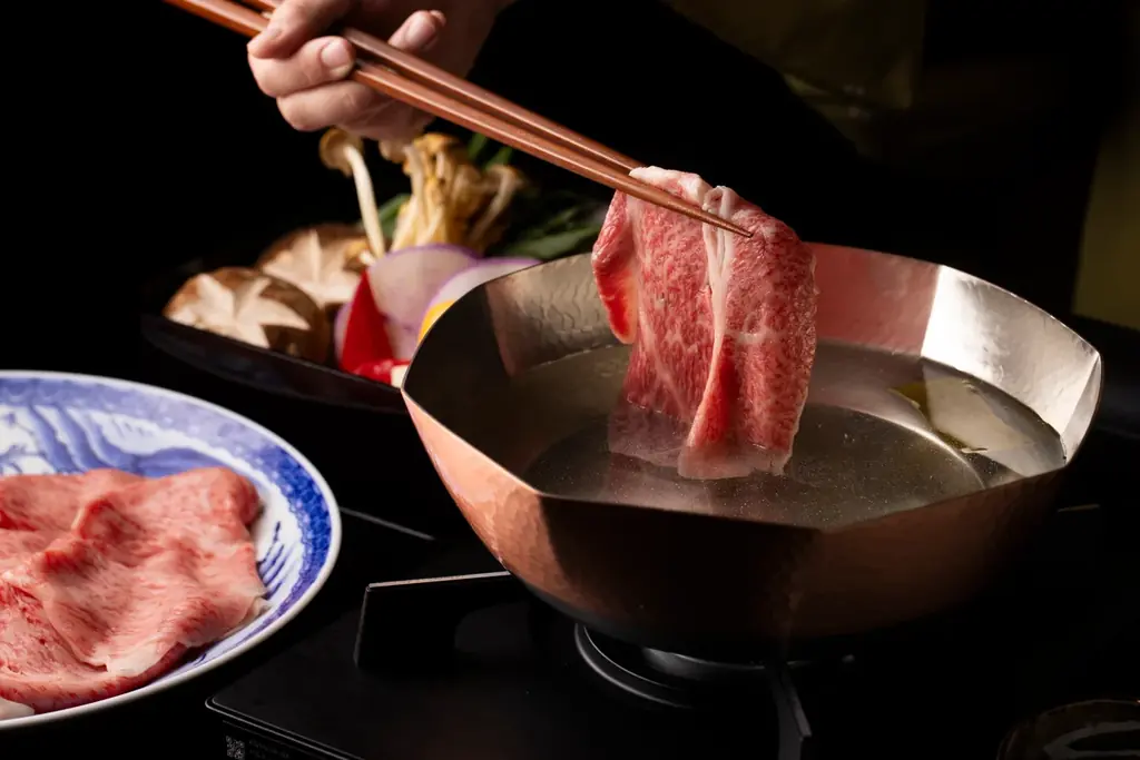 「すき焼き十二天」は全国から厳選したA5ランク和牛を提供し、すき焼きのほかにしゃぶしゃぶ、ビフテキ、オイル焼きなど多様な調理法で和牛の味わいを引き出します。贅沢にスライスしたA5和牛を基本に、料理ごとに部位の個性を生かした提供が行われます。