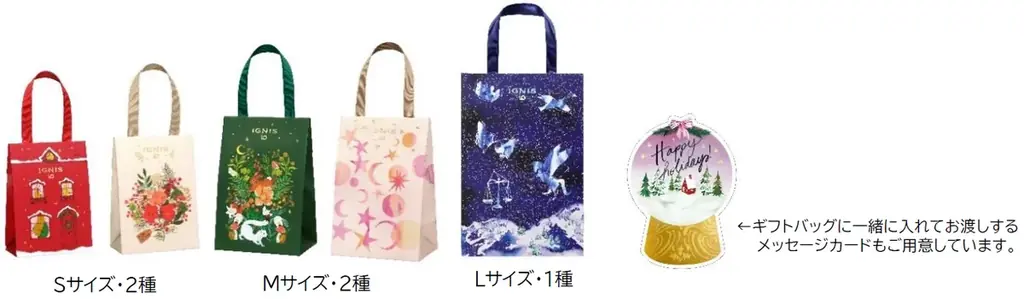 展開されるギフトバックはS/M/Lの3サイズ、全5種での提供となります。サイズと種類のバリエーションにより、ギフト用途や贈る相手の好みに合わせて選べる構成としています。配布は店頭での製品購入者に対する配布方式で、数に限りがあるため無くなり次第終了となります。
