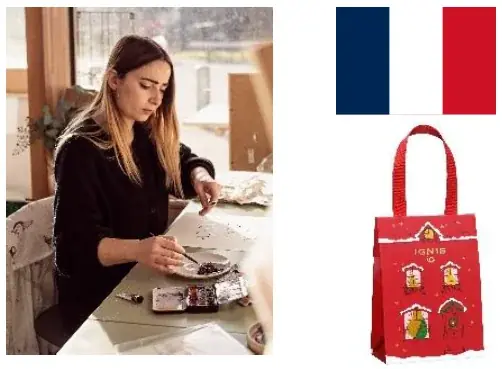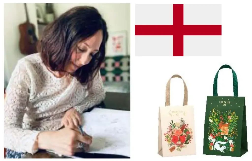 彼女の作品は動植物を生き生きと描くことに長けており、児童向け書籍やパッケージへの採用実績もあります。イグニス イオのギフトバックでは自然の要素を温かみのある色調で表現し、見る人に親しみやすさを与えるデザインとなっています。