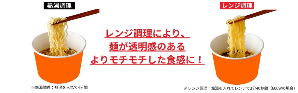 新製品「#もっちりノグリ(仮名)」では、レンジ加熱による麺の膨潤とスープの馴染みを活かすことで、既存の袋麺や従来のカップ麺とは異なる食感体験を提供する設計になっている点が強調されています。