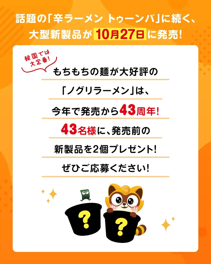 本発売に先立ち、株式会社農心ジャパンは「『#もっちりノグリ』先行体験キャンペーン」を実施します。応募期間は2025年10月1日(水)12:00から10月7日(火)23:59までで、対象は辛ラーメン公式のInstagram・TikTok・Xの各アカウントでの応募です。期間中に各SNSで応募条件を満たした方の中から抽選で各43名、合計129名に新製品を発売前に2個セットでプレゼントします。
