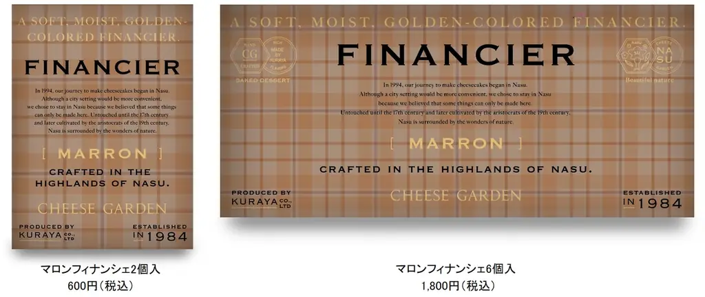 マロンフィナンシェは個数別の価格設定が明確に示されています。販売価格は2個入 600円/6個入 1,800円です。個包装で提供されるため配りやすさを重視したパッケージングです。