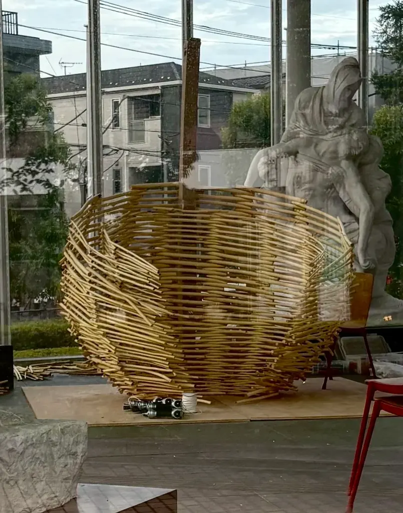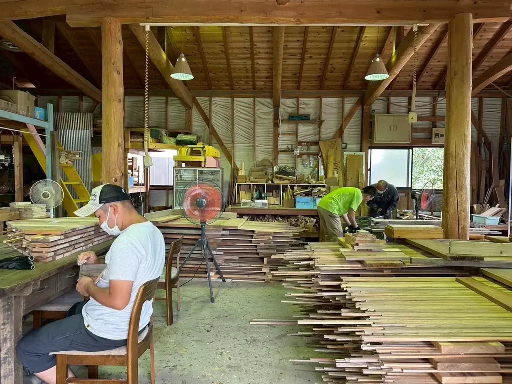 展示は、建築やデザインの価値観を見直し、素材や人との関わり方を問い直すことを目的とした実践として構成されました。具体的には古材の活用、鋼材の最小化、大学との協働によるかじがらモニュメント制作、就労支援B型事業所との協働制作など、産・学・福が連携した実践が組み込まれています。