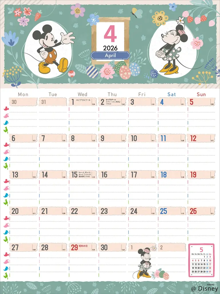 家族や個人の予定管理に適した『2026 ディズニー ファミリーカレンダー』は、一覧で見渡せる月めくりのフォーマットと書き込みやすさを重視しています。学校行事や習いごと、複数人の予定を一目で把握したい家庭に配慮した仕様です。