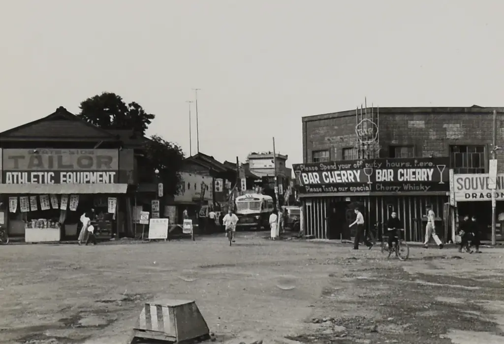 戦中・戦後の特集では、立川がかつて「軍都」としての性格を持ち、戦後に「商都」としての転換を遂げた経緯と、その過程で市民生活がどのように変わったのかを写真や史料で示しています。掲載された資料には、1952(昭和27)年頃に米兵向けの看板が並んでいた立川市曙町二丁目交差点を写した写真が含まれ、所蔵は立川市歴史民俗資料館となっています。