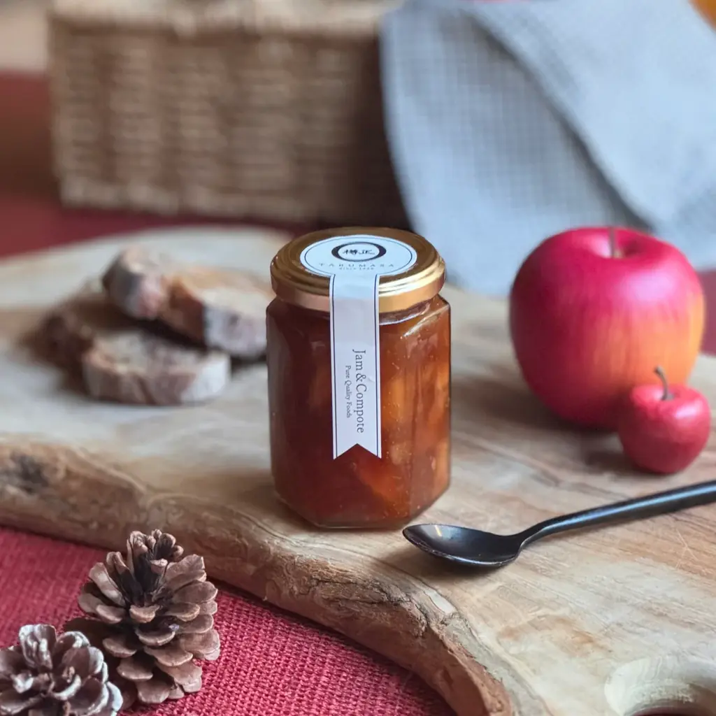 キャラメルりんごジャムは、青森県産の「サンふじ」を使用し、りんご本来のフルーティーな香りとシャキッとした食感を生かしたジャムです。手作りの焦がしキャラメルを合わせることで、ほのかなビターさと奥行きのある甘さが生まれています。