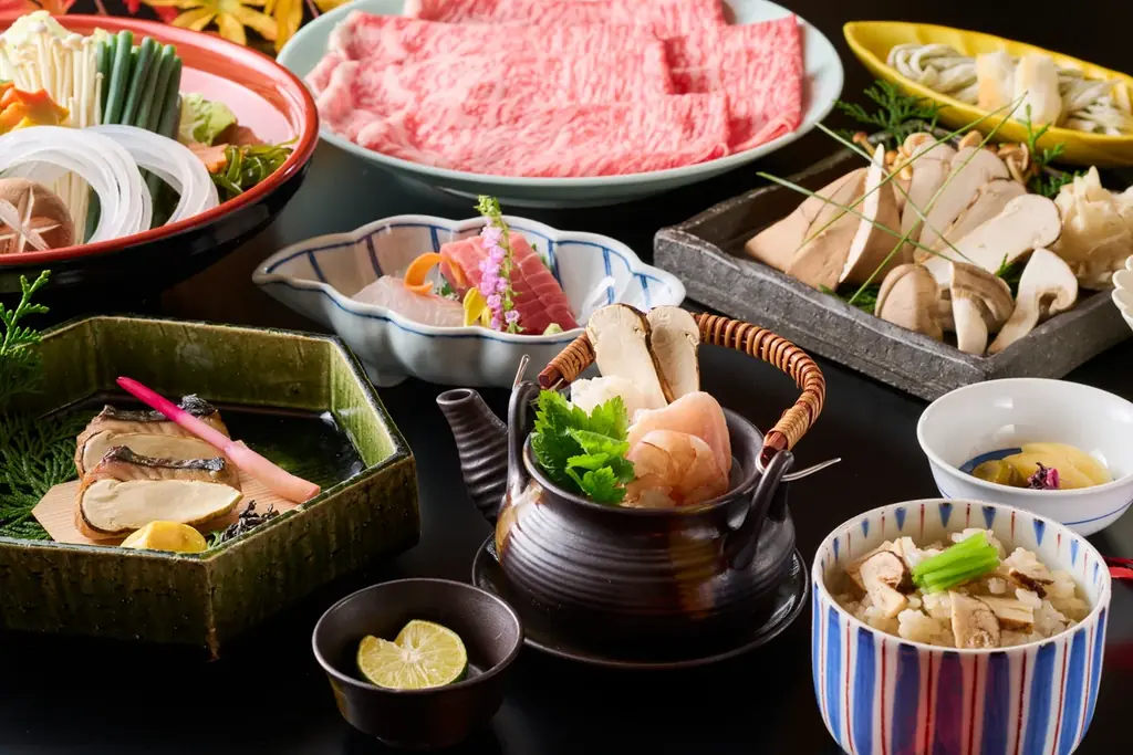 季節の素材としては、春は山菜・鯛、夏は鱧(はも)や鮑(あわび)、秋は松茸、冬はずわい蟹やふぐなどが挙げられており、しゃぶしゃぶやすき焼きとともに楽しめる構成になっています。季節コースは各しゃぶしゃぶ・すき焼きメニューに金額をプラスして注文する形式です。