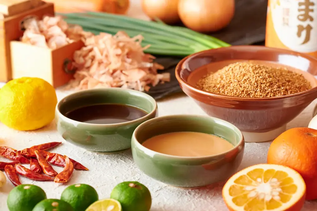 胡麻だれはコク深く風味豊か、ポン酢は柑橘の爽やかさを昆布・鰹出汁でまろやかに整えた味わいであり、さらに「特製出汁だれ」も用意されています。これらはしゃぶしゃぶ・すき焼きの肉と野菜の旨味を引き出す役割を果たします。