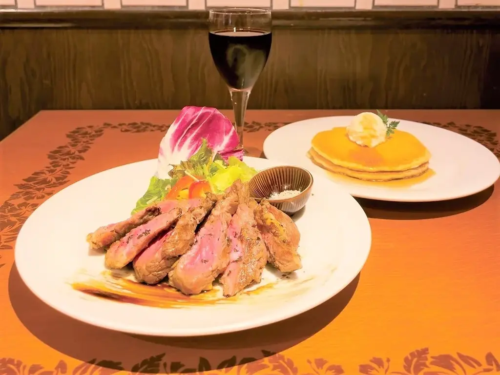 商品説明:牛ロースタリアータとホイップバターのパンケーキにワインを1杯サービスする限定メニュー。