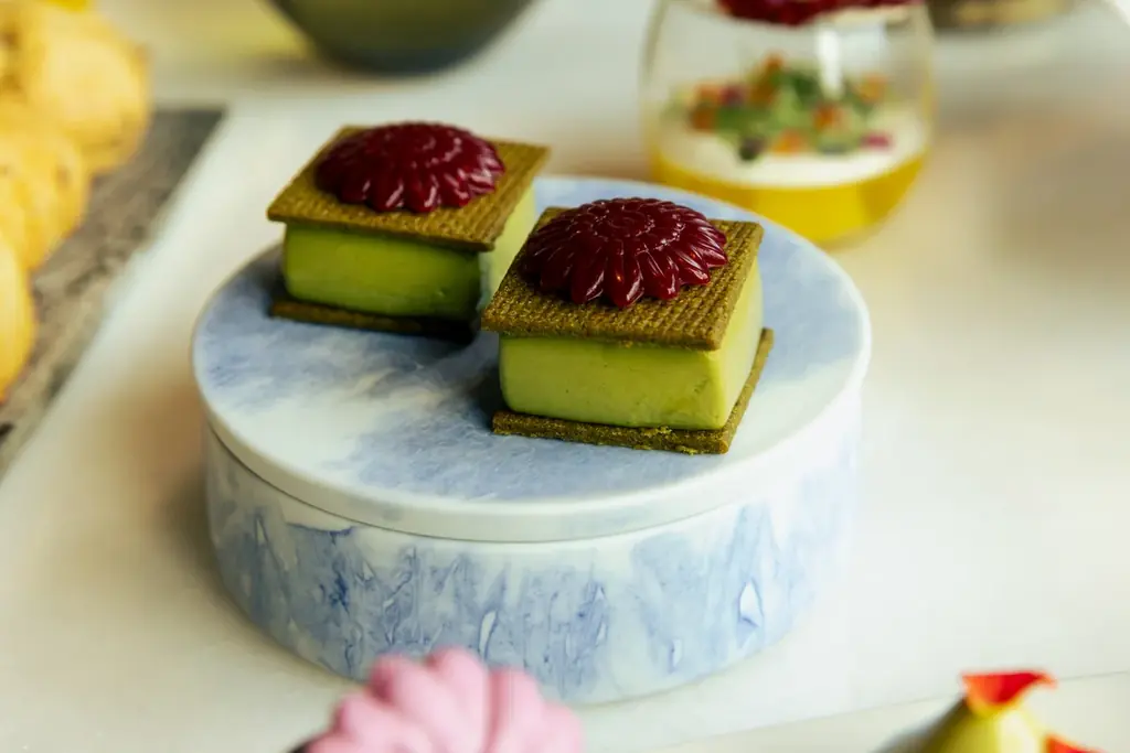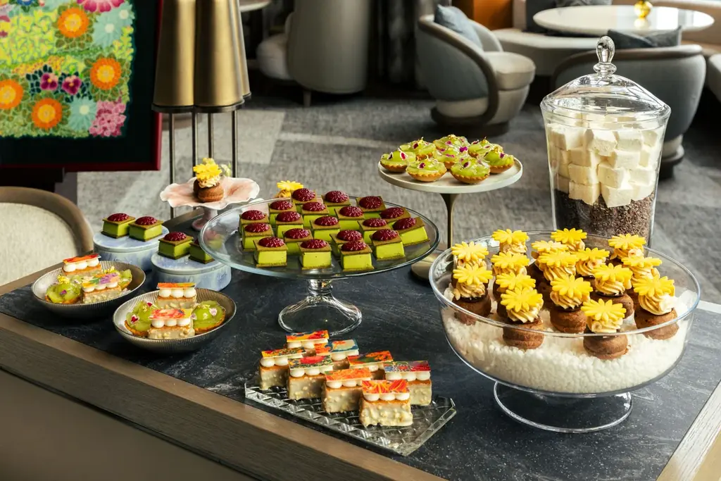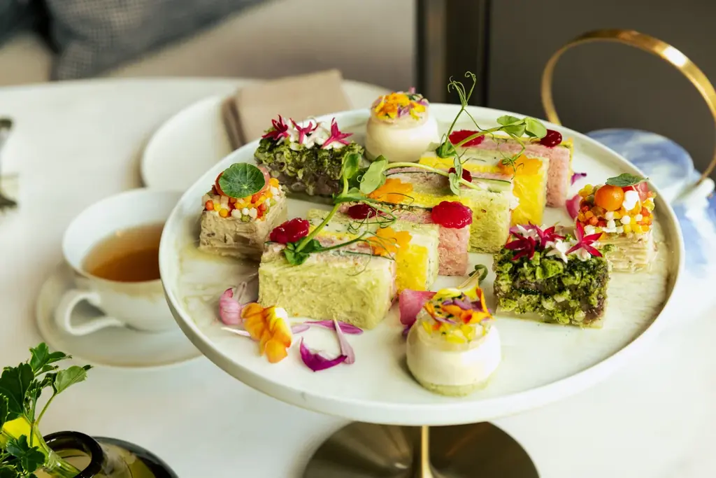 アフタヌーンティーは、セイボリー、フィンガーサンドイッチ、スコーン、スイーツ、そしてデザートトロリーで構成されます。各品はなかむら氏の色彩表現やモチーフに着想を得た見た目と味わいが意図されており、五感でアートを体験する設えとなっています。