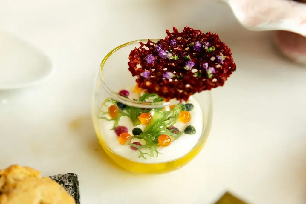 - 帆立のナージュ 海藻といくらのクリーム 紫蘇のエッセンス 花穂と真紅のチュイル