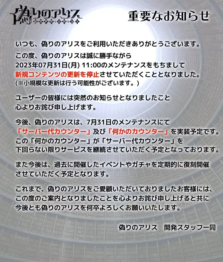 『偽りのアリス』は2019年にリリース後、2023年8月に新規コンテンツの更新を停止しました。ただし運営は完全終了ではなく、ゲーム内に設置した「サーバー代カウンター」と何かのカウンターの比率を基に、課金収入がサーバー代を下回らない限りはサービスを継続する方針へと切り替えられました。
