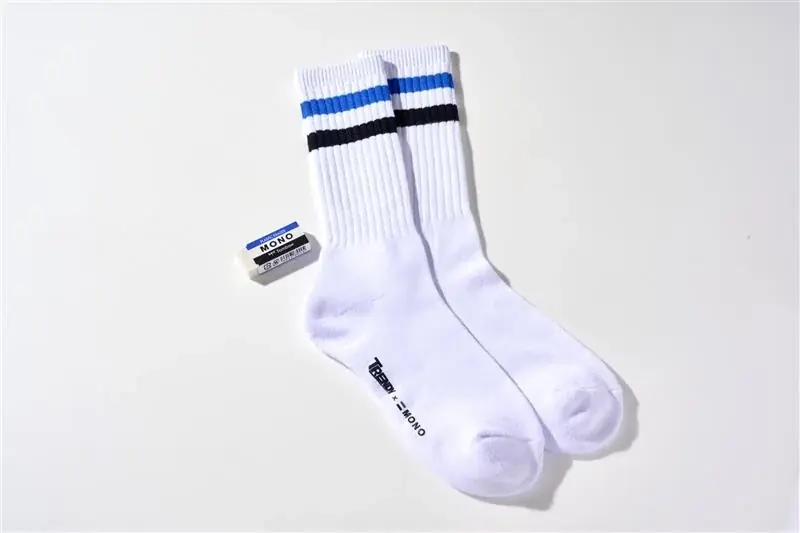 製品はラインソックスとして青白黒の3色柄が施されており、MONO消しゴムを想起させる意匠を靴下に精緻に落とし込んでいます。以下に主な仕様と機能を整理します。