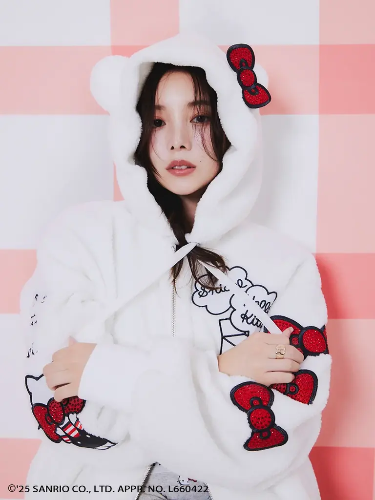 コラボのテーマはハローキティのトレードマークであるリボン。ニットやパーカー、バッグ、チャーム、イヤーマフ、ヘアピンなど幅広い全11型で展開され、限定タグやギフトボックスから覗くキティのビジュアルなど、ファン心をくすぐるディテールが各所に取り入れられている。