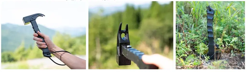 打ち込みやすさと抜きやすさを両立した設計のハンマーです。アシンメトリーダブルフックによりペグの抜き取りがしやすく、重量ヘッド(約550g換算)で打ち込みやすい仕様になっています。ヘッドを下にして立てられるため、キャンプサイトでの紛失対策にも配慮されています。