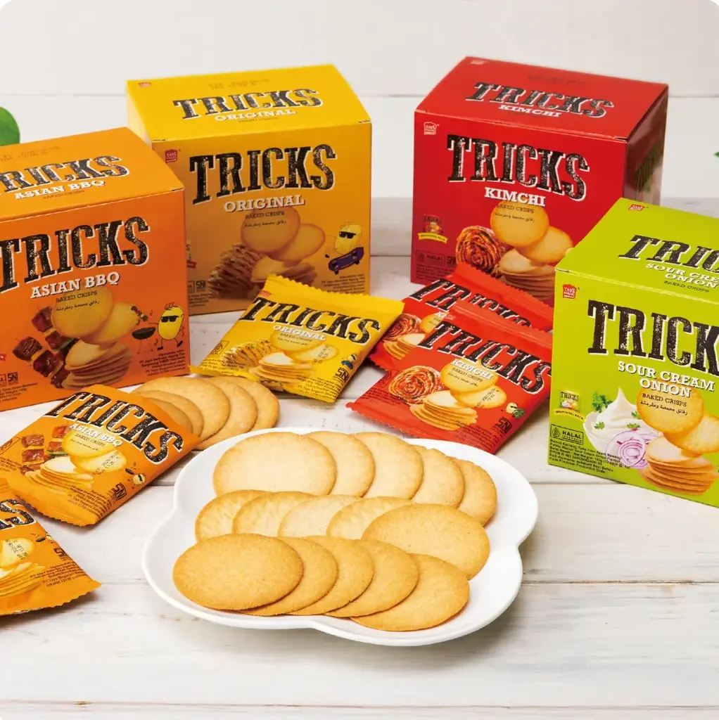 TRICKS製品情報 | ノンフライチップス(小麦粉とジャガイモ使用)、個包装15g×12袋入り、4フレーバー(オリジナル・キムチ・アジアンBBQ・サワークリームオニオン)。ガルーダ航空国際線機内での提供実績あり。 |