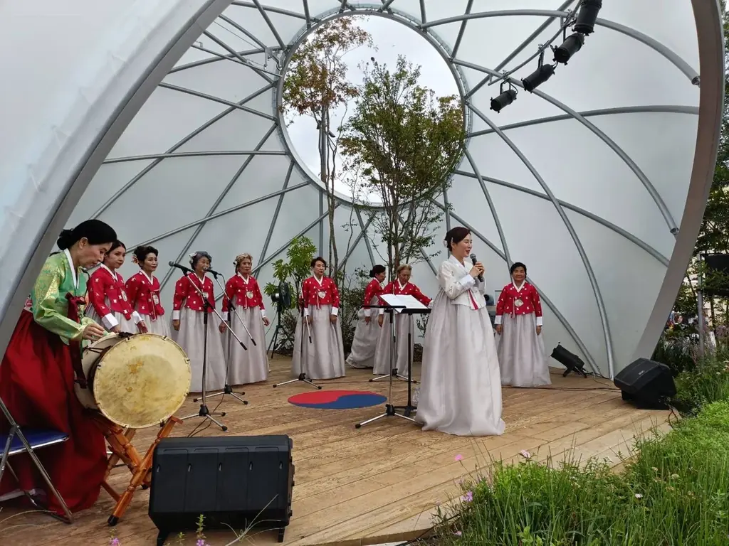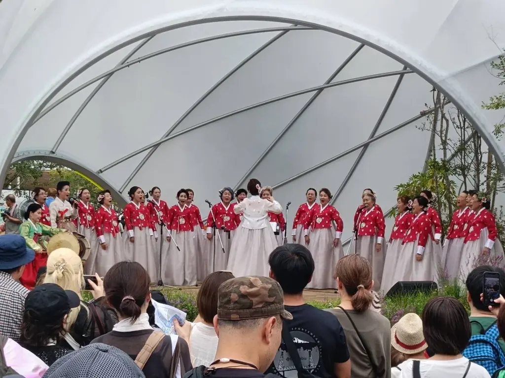 オモニコーラスは9月26日に大阪・関西万博2025のポップアップステージ東外、韓国パビリオン前で合唱を行いました。当日は来場者を前にして、故郷への思いと日本での日常、平和と共生への願いを歌に託し、観客の幸せを願う合唱を披露しました。
