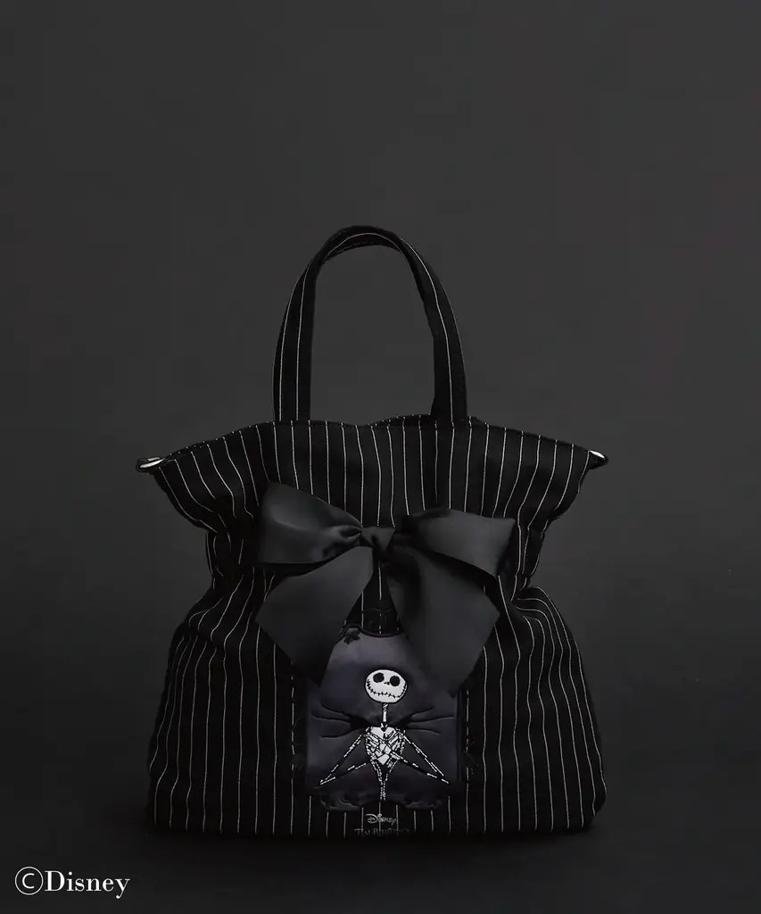 2Wayミニトートは「ジャック・スケリントン」のコスチュームをイメージしたストライプ生地を使用し、キャラクター刺繍とシルバー箔のロゴプリントを施して華やかさを演出しています。