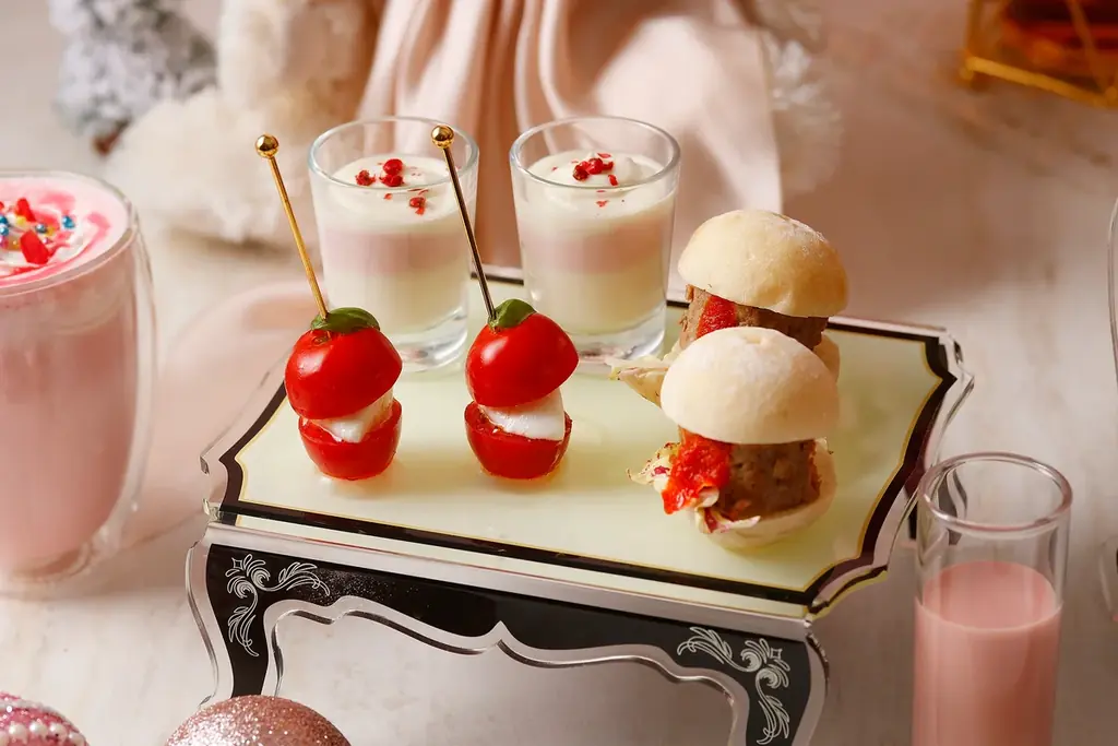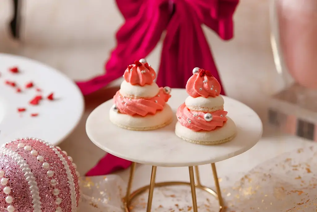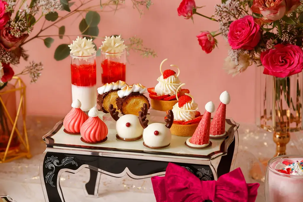 本アフタヌーンティーは“ピンクフル・ホリデー”をテーマに、ガーリーピンクとホワイトを基調としたビジュアルを重視しています。スタンドには大きなベロアリボンが飾られ、トナカイやサンタ帽子を模したスイーツがクリスマスオーナメントのように並びます。