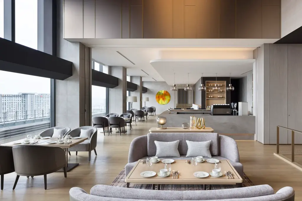 THE LOBBY LOUNGEは、初代大阪駅の切妻屋根をモチーフにした高い天井(約10メートル)による『光の屋根』と、線路を想起させる巨大なアートが象徴的な空間です。旅人たちの時間に寄り添うラウンジとして設えられており、29階からの眺望とともに特別なティータイムを演出します。