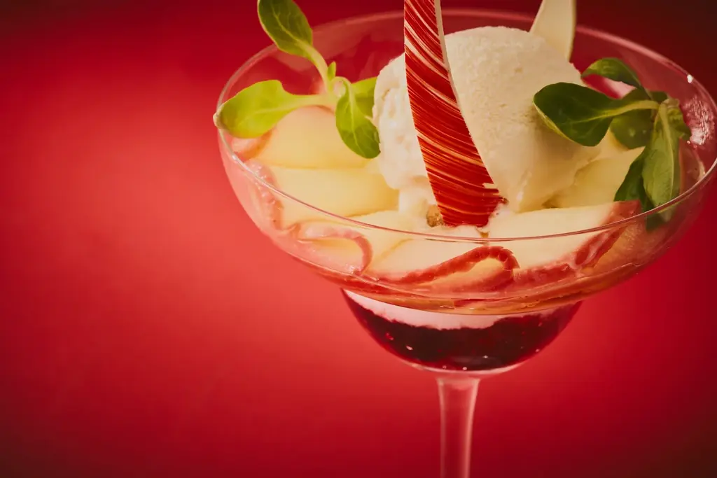 - パルフェ:花びらのように配した軽く煮たりんごのスライスを飾るパルフェ。構成はトップにバニラアイス、途中にりんごソースとシナモンキャラメルソース、ボトムには生クリーム、ミックスベリー、カルヴァドスのジュレなど。食べ進めるごとに味の層が変化する設計。