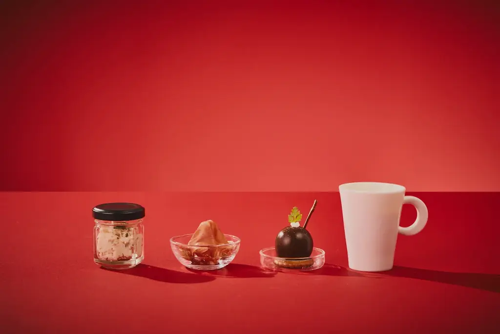 - りんごムース:輝くような赤色のムースで、軽やかな口あたりと果実感を表現。