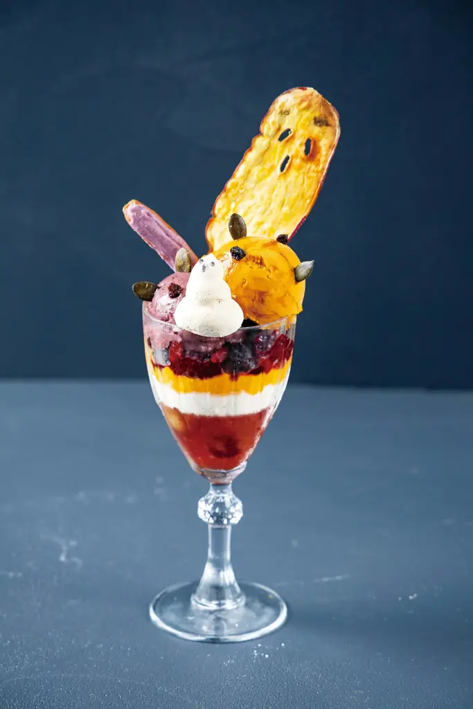 地下1階のファーイーストバザールでは、かぼちゃとブルーベリーのジェラートに赤葡萄ジュレやバニラクリームを重ねた「ハロウィンパフェ」(1個)を2,090円で販売します。販売場所は地下1階のファーイーストバザールです。