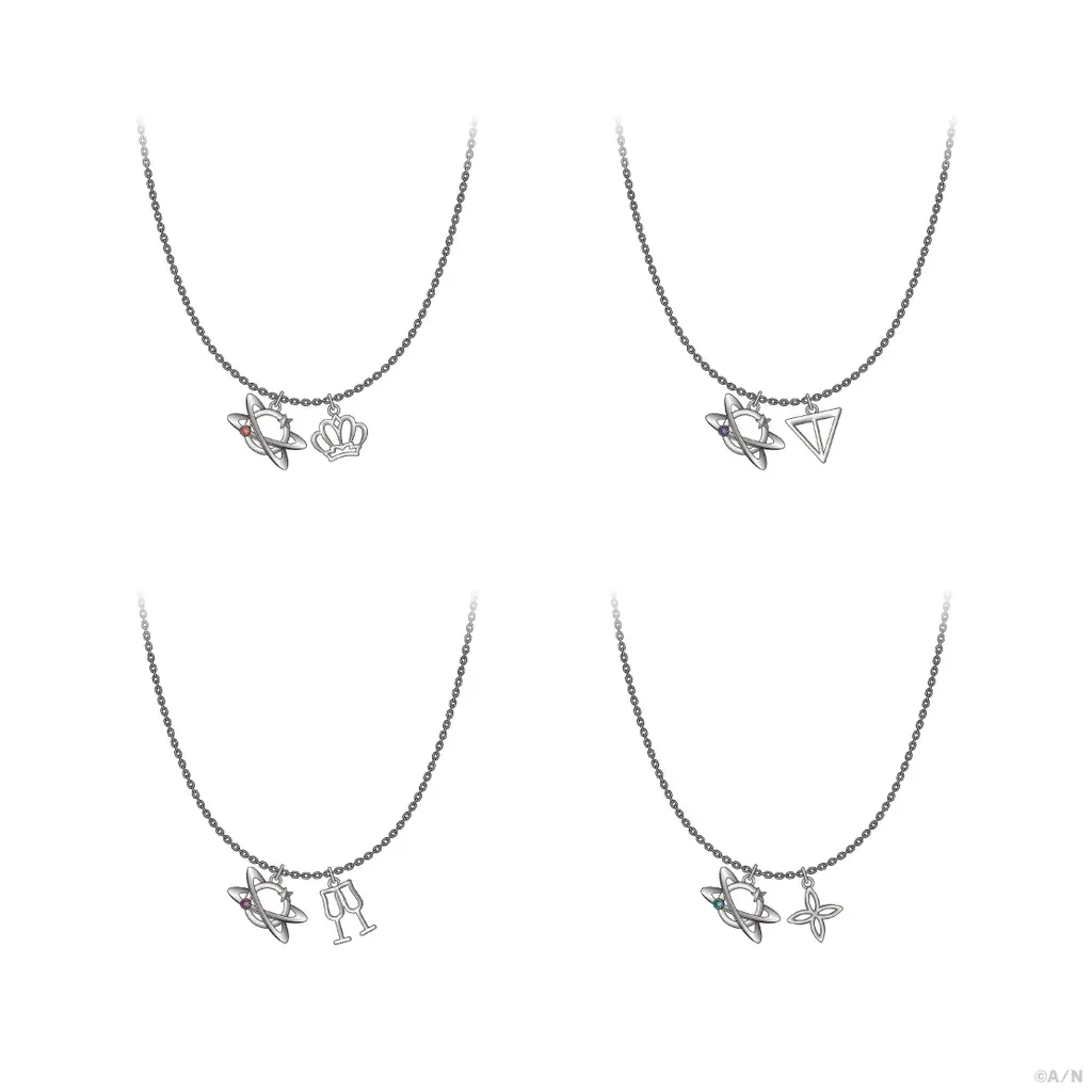 価格:各5,200円(税込)。全4種。共通モチーフは約W14mm×H10mm以内、ライバーモチーフは約W12mm×H10mm以内、チェーンの長さは約400mm+アジャスター約50mm、メッセージカードは約W50mm×H70mm、BOXは約W100mm×H87mm×D30mm。素材は亜鉛合金、ガラスストーン(本体)、紙(メッセージカード・BOX)。購入はお一人様1会計につき各5点までとなります。
