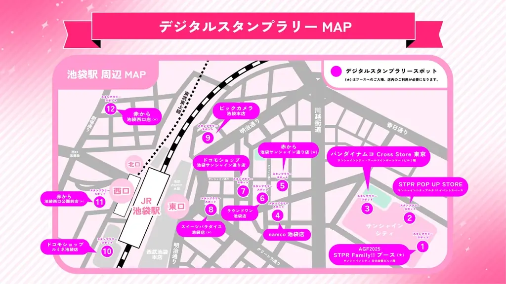 AGF2025期間中、池袋エリアでの回遊を促すデジタルスタンプラリーおよびサンシャインシティアルタ内での期間限定ポップアップストアが同時開催されます。スタンプラリーはスマートフォンを用いた参加形式で、達成に応じてノベルティが用意されています。