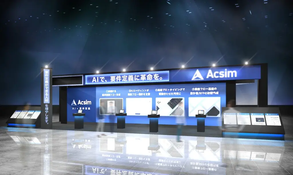 ブースでは複数のデモを通じて、Acsimがどのように要件定義から設計までを支援するかを順を追って示します。主な展示要素は「会話からの業務フロー自動生成」「課題抽出と改善方針の提示」「AIエージェントによるToBe設計支援」「動くプロトタイプの自動生成」「設計書/RFPの自動生成」となります。