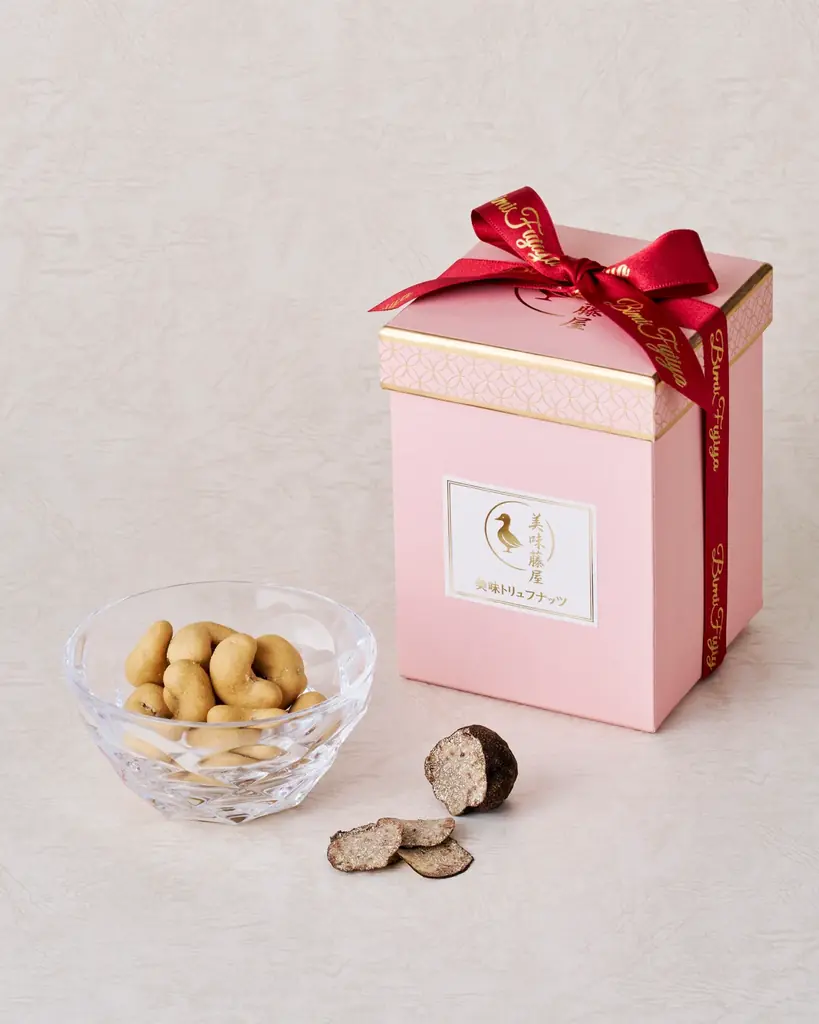 - 美味トリュフナッツ— アメリカ産カシューナッツにトリュフ塩を使用。容量:130g、価格:¥2,700(税込)。