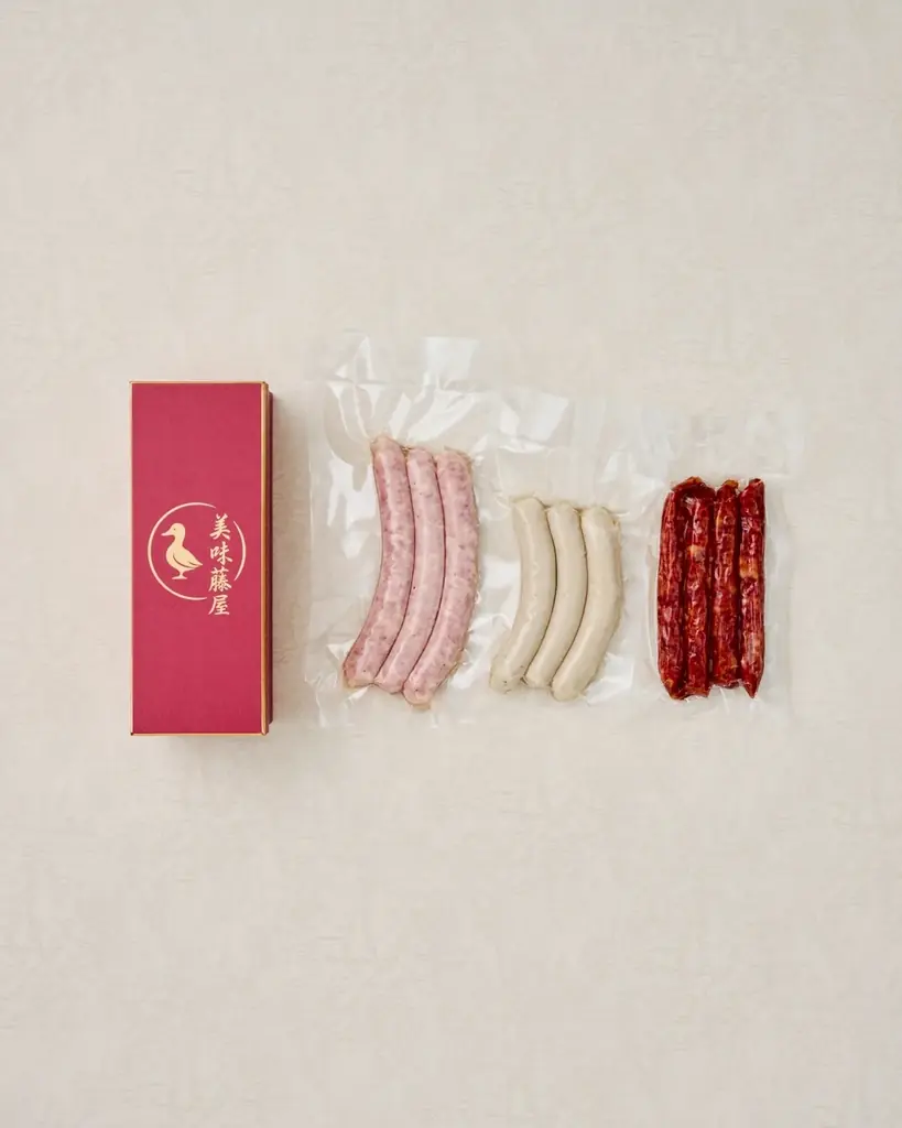 - 美味藤屋ソーセージ3種(腸詰・トリュフソーセージ・青唐辛子ウィンナー)— 価格:¥4,860(税込)、容量:570g。青唐辛子ウィンナーは酸味と辛み、トリュフソーセージは黒トリュフとトリュフオイル使用、腸詰はチャイニーズスタイルのドライソーセージ。