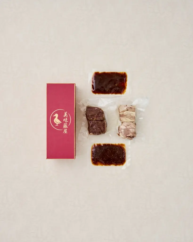 - 美味藤屋ビーフ赤ワイン煮— 国産牛ホホと牛バラを赤ワインでじっくり煮込み、お箸でほぐれる柔らかさ。特製バルサミコソース、特製ジンジャーソース付。価格:¥5,940(税込)、容量:400g。