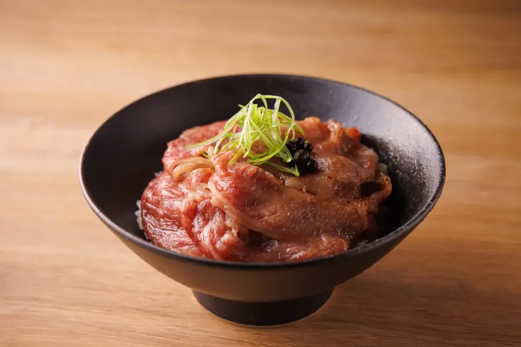 • 炙り和牛めし(限定20食) ¥550 — 国産黒毛和牛スライスを炙り、甘辛ダレで仕上げたすき焼き風の丼。濃厚な満月たまごを絡めることで極上の味わいとなる。1日限定20食。
