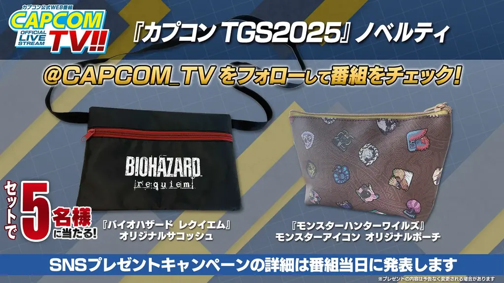 また、東京ゲームショウ2025のカプコンノベルティグッズが抽選で当たるキャンペーンを実施予定とされています。キャンペーンの詳細(応募方法、期間、当選発表など)は番組内または公式の告知で案内される見込みです。